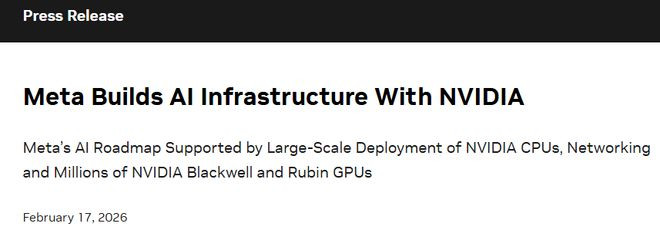 财联社2月18日讯(编辑赵昊)当地时间周二(2月17日),Meta和英伟达宣布,两家美国科技巨头建立了新的长期合作伙伴关系,涵盖本地部署、云和人工智能(AI)基础设施。