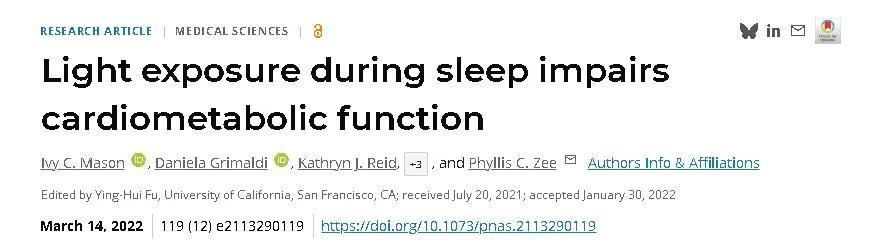 ②Mason, Ivy C., et al. "Light exposure during sleep impairs cardiometabolic function." Proceedings of the National Academy of Sciences 119.12 (2022): e2113290119.